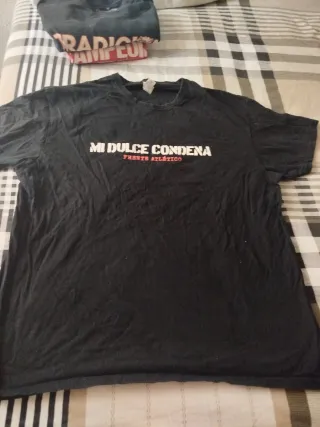 Camiseta negra con el lema Mi Dulce Condena y Frente Atlético. - Diseño frontal con texto. - Cuello redondo.