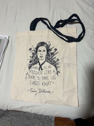 Bolsa de tela con un diseño inspirado en Emily Dickinson. - Ilustración de Emily Dickinson. - Cita There is no frigate like a book to take us lands away. - Asas negras.
