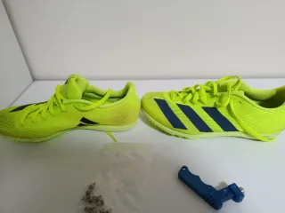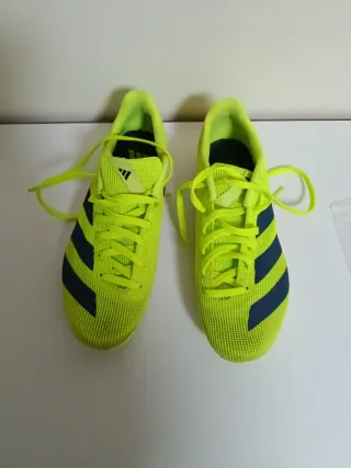 Zapatillas de atletismo de clavos Adidas para niño en llamativo color verde con detalles en azul. - Diseño deportivo. - Cierre con cordones. - Clavos y llave incluidos - Talla 36 2/3