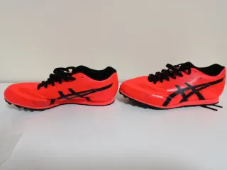 Zapatillas de atletismo con clavos Asics en llamativo color naranja con detalles en negro. Ideales para la pista. Usadas en tres ocasiones para correr. - Incluyen clavos y llave.