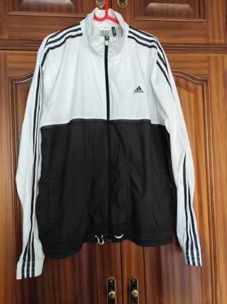 Chaqueta cortavientos de la marca Adidas, ideal para protegerse del viento y la lluvia. - Diseño bicolor en blanco y negro. - Mangas con las icónicas tres rayas de Adidas. - Cremallera frontal completa. - Puños y cintura elásticos con cordón ajustable.