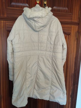 Abrigo largo de color beige, talla 50/52. - Diseño acolchado. - Capucha con pelo. - Bolsillos con cremallera.