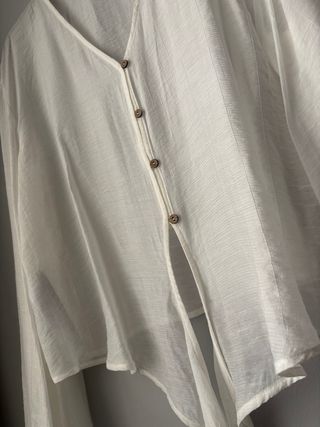 Blusa en color blanco en tejido semitransparente de manga larga con detalle de botones y nudo frontal. Está nueva, sin estrenar. #blusa #blusamujer #blusamangalarga #blusablanca #blusablancasemitransparente #blanco #detallenudo #nudo #mango