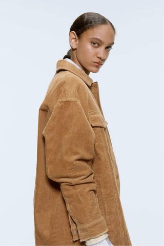 Sobrecamisa de pana en color camel con cuello solapas, de manga larga y con bolsillos delanteros. Bajo con acabado desflecado. Cierre frontal con botones. Tiene uso, pero está en buen estado. #sobrecamisa #sobrecamisamujer #sobrecamisapanazara #sobrecamisapana #pana #camel #marrón #zara