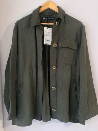 Sobrecamisa / camisa rústica en color caqui con cuello solapa, bolsillos delanteros, trabillas laterales y de manga larga acabada en puño con botón. Cierre frontal mediante botones. #camisa #camisazara #camisarusticazara #camisarusticacaqui #sobrecamisa #sobrecamisamujer #sobrecamisazara #sobrecamisarustica #sobrecamisarusticazara #rustica #rusticacaqui #caqui #zara