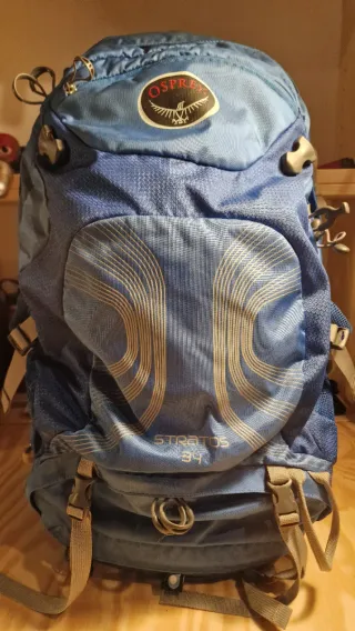 Mochila Osprey Stratos 34 en color azul y beige. Se encuentra en muy buen estado, con muy poco uso. - Diseño moderno con detalles en beige. - Capacidad de 34 litros.