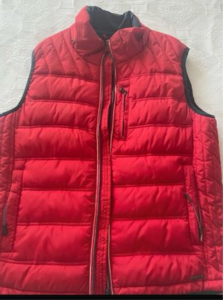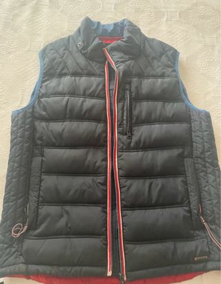 Chaleco acolchado con un diseño moderno y detalles llamativos. - Cierre frontal con cremallera. - Bolsillo con cremallera en el pecho. - Ribete de contraste en las mangas. - Forro interior rojo.