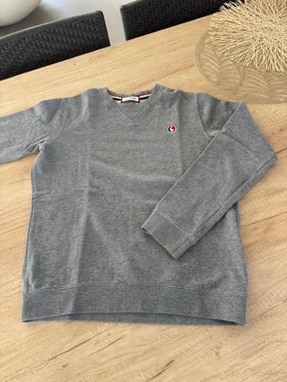 Sudadera de manga larga en color gris. La vendo porque se ha quedado pequeña. Muy buena calidad, - Cuello redondo con detalle de ribetes. - Pequeño logo bordado en el pecho.