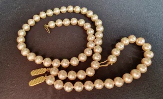 Elegante juego de collar y pulsera de perlas Majorica. - Perlas de color beige con detalles dorados. - Cierre de gancho en el collar. - Dos colgantes dorados con diseño de líneas.