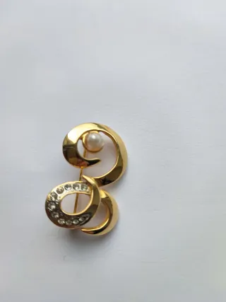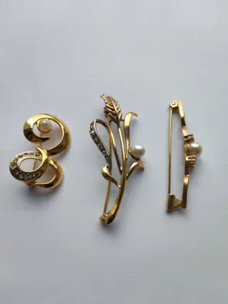 Conjunto de tres broches de estilo vintage con detalles de perlas y pedrería. - Broche con diseño curvo y perla. - Broche de espiga con pedrería y perla. - Broche alargado con pedrería y perla. - Dorados pero no oro - En buen estado en general sin signos de grandes daños pero con señales de uso. Descuento por compra de más productos.
