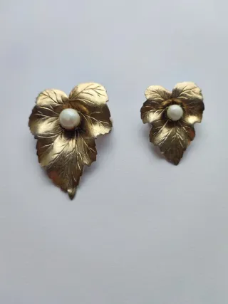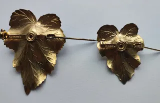 Conjunto de dos broches vintage con diseño de hoja y perla central. - Diseño de hoja detallado. - Perla sintética en el centro. - Acabado metálico dorado (no oro). - En buen estado con signos menores de uso. - Sujeción mediente alfiler con cierre de seguridad. Descuento por compra de más productos.