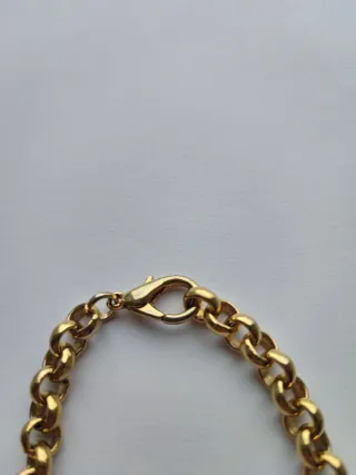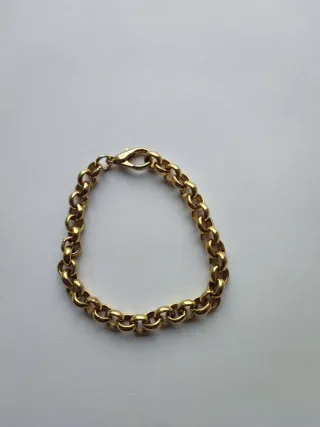 Elegante pulsera con eslabones gruesos. - Diseño llamativo y moderno. - Cierre de mosquetón. - Acabado dorado (no oro). - 19cm de longitud. - Buen estado, si señales de grandes daños. Negociable por compra de más productos.