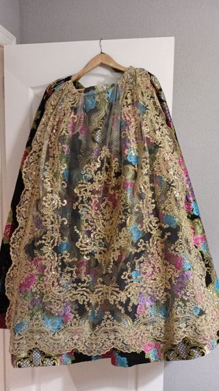Traje de fallera para adulta con un diseño elegante y llamativo. - Tejido principal negro con estampado floral multicolor. Tejido sedalina. - Delicado encaje dorado con lentejuelas. - Diseño intrincado y detallado. De regalo tel negra para corpiño de manga larga Talla 44 aprox