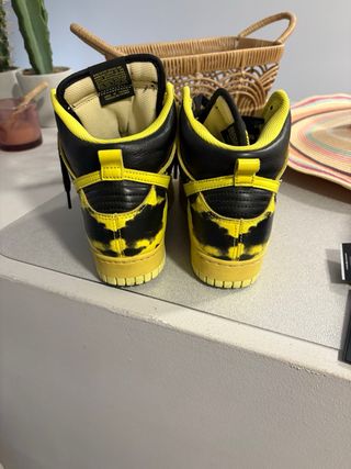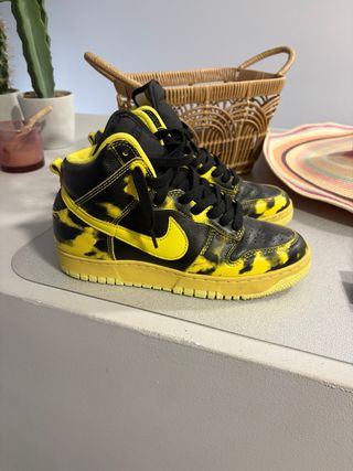 Zapatillas altas Nike Dunk con un llamativo diseño. - Combinación de colores negro y amarillo. - Cordones negros. - Suela de goma amarilla.