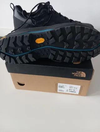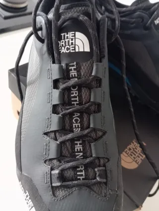 Zapatillas de montaña The North Face en color negro y gris. Perfectas para tus aventuras al aire libre. - Diseño moderno y funcional. - Materiales resistentes para mayor durabilidad. - Cordones negros para un ajuste seguro.