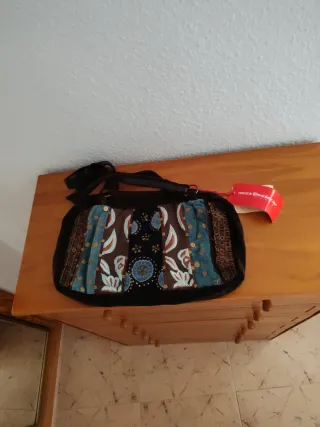 Bolso de la marca Miss Sidecar con un diseño único y llamativo. - Combinación de colores marrón y azul. - Adornado con lentejuelas y detalles bordados. - Asa de hombro. - Cierre de cremallera.