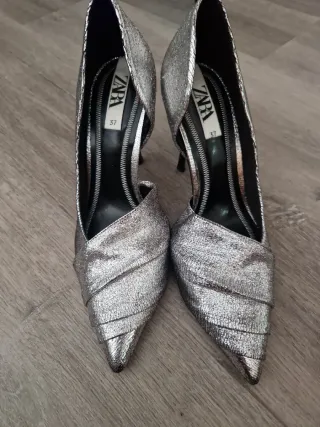 Elegantes zapatos de tacón de Zara, usados solo dos veces. - Diseño plateado brillante. - Talla 37.
