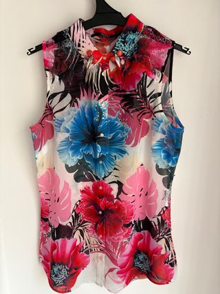 Blusa sin mangas con un vibrante estampado floral. - Diseño con cuello camisero. - Cierre de botones al frente. - Detalle de pedrería en el cuello.