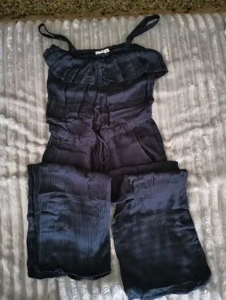 USADO SOLO 1 VEZ Mono de Mango en color azul marino. Presenta un diseño con volantes en el pecho y cintura ajustable con cordón. - Volante en la parte superior. - Cierre de botones en el pecho. - Cintura con cordón y detalle de borla. - Bolsillos laterales.