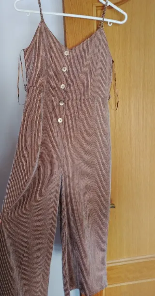 Mono largo con un diseño de rayas verticales. Ideal para un look casual. - Cierre de botones en la parte delantera. - Tirantes finos. - Detalle de lazo en la espalda.
