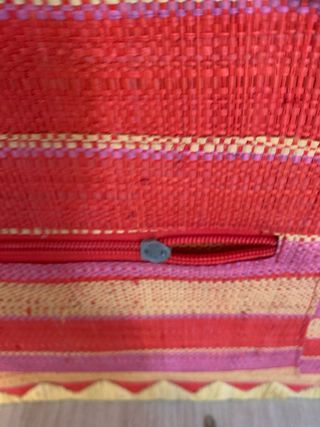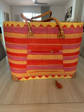 Capazo de mimbre con un diseño de rayas vibrantes. Perfecto para llevar tus esenciales con estilo. La cremallera está rota. - Material de mimbre tejido. - Asas de cuero. - Bolsillo exterior con cremallera. - Detalle de flecos en la parte superior. - Adorno de borla en la parte inferior.