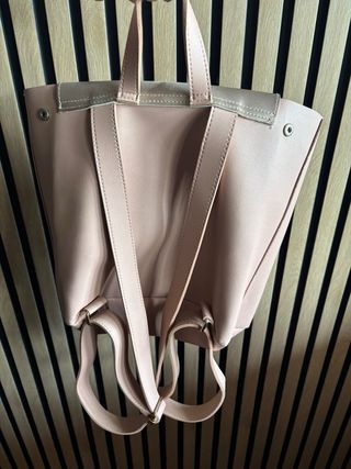 Mochila de la marca Guess con un diseño moderno y elegante. - Color principal rosa pálido. - Solapa frontal en tono dorado. - Detalle de logo circular en la solapa. - Cierre de solapa con broche. - Correas ajustables.