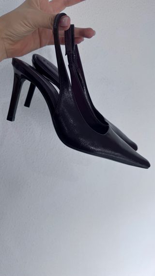 Elegantes tacones de punta fina con tira al talón. Color burdeos Usados una hora Nueva coleccion. - Tacones de aguja. - Diseño destalonado. - Acabado brillante.