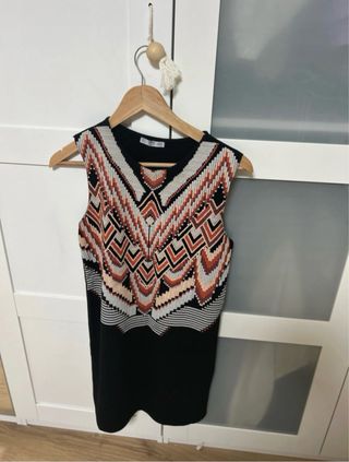 Vestido sin mangas de Zara con un diseño geométrico vibrante en la parte superior y una base negra. - Diseño de cuello redondo. - Estampado étnico multicolor. - Corte recto.