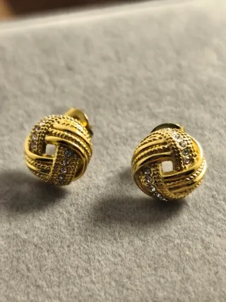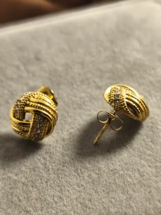 Elegantes pendientes chapados en oro de 18 quilates con un diseño entrelazado y adornados con pequeñas circonitas brillantes. - Diseño esférico con detalles texturizados. - Incrustaciones de circonitas para un toque de brillo. - Cierre seguro para un uso cómodo.
