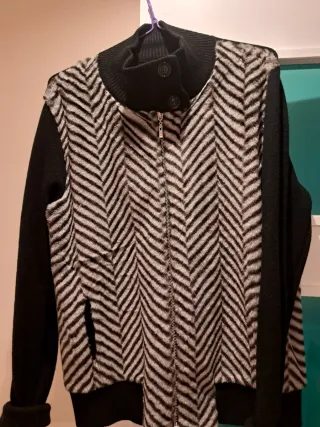 Chaqueta de punto con un diseño llamativo y moderno. - Mangas largas de punto negro. - Cuerpo delantero con estampado de espiga en gris y negro. - Cuello alto de canalé negro. - Cierre de cremallera frontal. - Dos bolsillos laterales. - Puños y bajo de canalé negro.