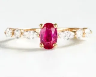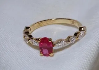 Anillo oro amarillo 18k con rubí tierra 100% natural talla ovalada, de 0.61ct y 8 diamantes laterales naturales alternos de talla marquesa y redonda de 0.57tcw. Peso 1.84 gramos. Diametro interior de 16.25 mm. Certificación AIG #J3312019726. Nuevo sin estrenar.