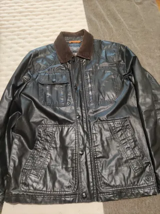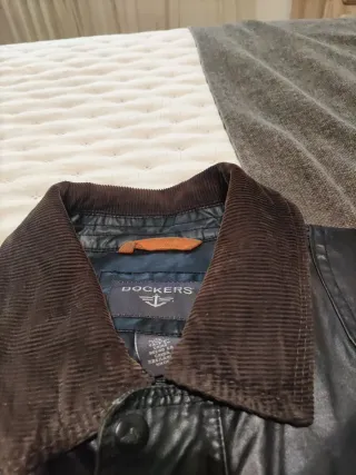 Chaqueta estilo vintage de la marca Dockers. Un diseño clásico con un acabado encerado que le da un toque único. - Cuello de pana. - Bolsillos frontales con solapa. - Cierre de botones. - Puños ajustables.