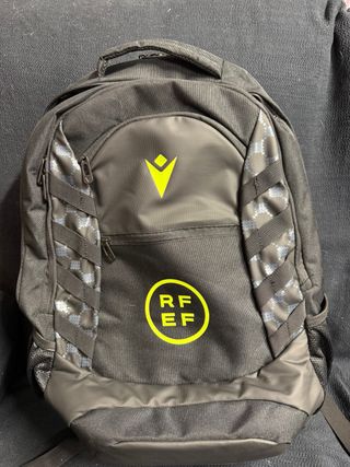 Mochila de la marca Macron con el logo de la RFEF. - Diseño en color negro y detalles multicolores. - Logo de la RFEF en la parte frontal. - Logo de Macron en la parte superior. - A estrenar.