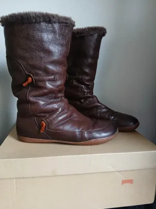 Botas de la marca Camper. - Exterior de piel marrón. - Forro interior de pelo sintético. - Detalle de cordón naranja. - Suela de goma. Las vendo porque me dan mucho calor para lo que acostumbro pero están de un estado muy bueno. La plantilla también es de pelo pero se podria cambiar.