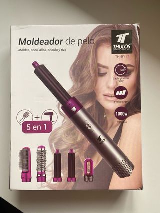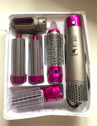 Set de secador y rizador de pelo 5 en 1 con accesorios intercambiables. - Incluye secador, cepillo redondo, cepillo de aire caliente, moldeador y concentrador. - Diseño en color rosa y plateado.