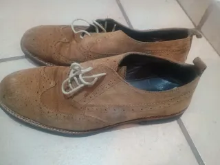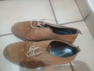 Elegantes zapatos de ante con un diseño clásico. - Color beige y marrón. - Detalle de picado decorativo. - Cordones blancos.