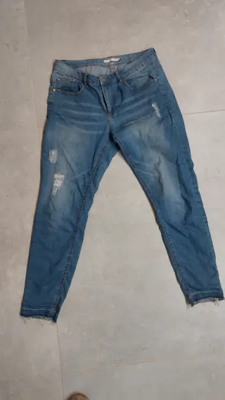 Pantalón vaquero de mujer con un diseño moderno y detalles desgastados. - Corte ajustado. - Efecto desgastado en rodillas y bajo. - Cintura con trabillas para cinturón. - Cierre de cremallera y botón.