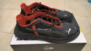 Zapatillas deportivas Puma Replicat X Circuit en color negro con detalles en rojo. - Diseño deportivo y moderno. - Cierre con cordones. - Logo de Puma en blanco. - Simulador cockpit iracing, Logitech, moza, assetto. Un solo uso. Se venden porque me apretan en la parte delantera.