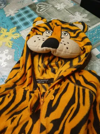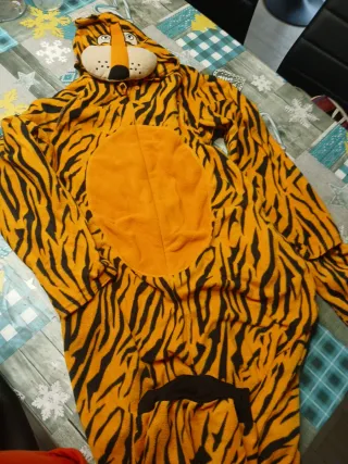 Disfraz de tigre para adulto con estampado de rayas. - Diseño con capucha. - Material suave y cómodo. - Tiene cola - Incluye una manopla