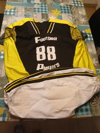 Disfraz de jugador de rugby con diseño llamativo. - Camiseta negra y amarilla con número 88. - Pantalón blanco con detalles. - Ideal para fiestas temáticas o eventos. - Parte superior Oversized