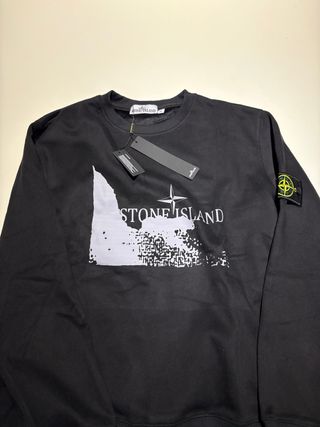 Sudadera Stone Island con un diseño gráfico llamativo. - Detalle gráfico en gris sobre fondo negro. - Logo de Stone Island visible.