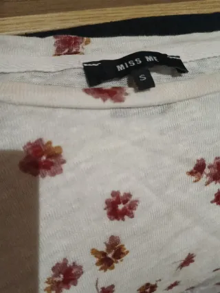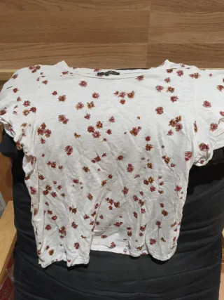 Camiseta de manga corta con un bonito estampado de flores en tonos rojos y marrones sobre fondo blanco. - Diseño floral. - Cuello redondo. - Manga corta.