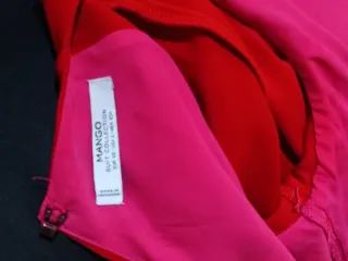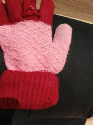Par de guantes de lana con un diseño divertido. - Parte superior de los dedos en rojo. - Puño de canalé en rojo. - Tejido principal en rosa con patrón. - Detalle de puntos en el puño.