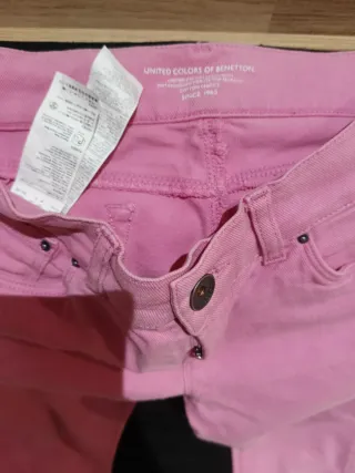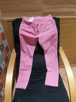 Pantalones de corte ajustado en color rosa. - Cintura con cierre de botón y cremallera. - Bolsillos delanteros y traseros. - Tejido vaquero.