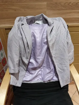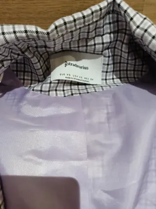 Americana con un diseño de cuadros en tonos morado y blanco. El forro interior es de color lila. - Diseño de cuadros. - Forro interior lila.