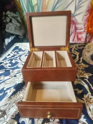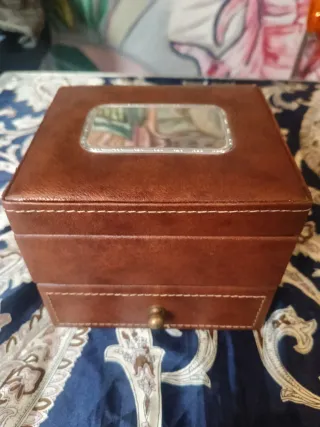 Tiene una manchita en el cajon. Elegante joyero de dos niveles con acabados en piel sintética. - Compartimentos interiores para organizar joyas. - Cajón extraíble para mayor espacio de almacenamiento. - Forro interior suave para proteger tus pertenencias.