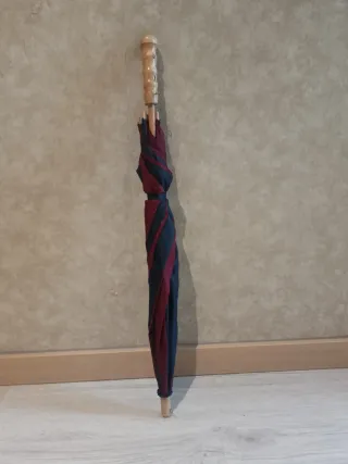 Paraguas clásico con un diseño atemporal. - Mango de madera tallada. - Tejido a rayas en tonos azul marino y burdeos.