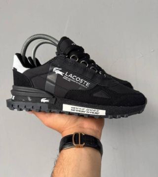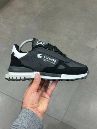 Zapatillas de la marca Lacoste en color negro con detalles blancos. Un diseño moderno y elegante. - Logo de Lacoste en el lateral. - Cordones negros. - Suela de goma con diseño. - Detalles de texto en la suela.