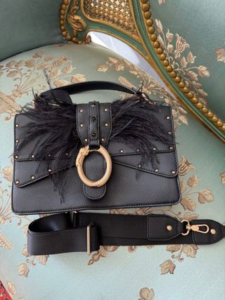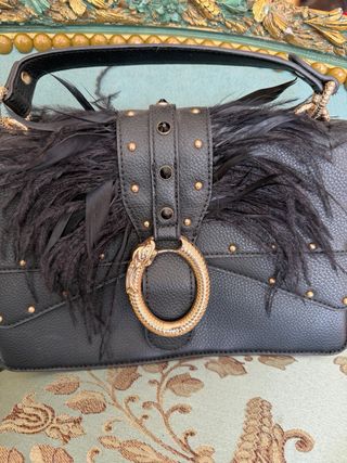 Elegante bolso Liu Jo con un diseño único. - Detalles de plumas negras. - Adorno frontal con forma de serpiente dorada. - Tachuelas doradas. - Correa ajustable. - Medidas aproximadas: 27x19 cm.
