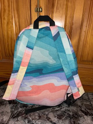 La mochila se encuentra en perfectas condiciones ya que ha sido muy bien cuidada, no tiene ningún desperfecto, es espaciosa ya que cuenta con varios bolsillos y sus correas son regulables además de tener unos colores muy bonitos.